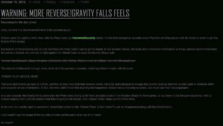 Some very old mentions of Reverse Falls came from NSFW websites. But even they were from 2013. But personally, I felt that this AU is much older than 5 years. Given the Hand that Rocks the Mabel aired on July 6th 2012 and saw Gideon’s introduction, any early mention of Reverse Falls had to have come from then.